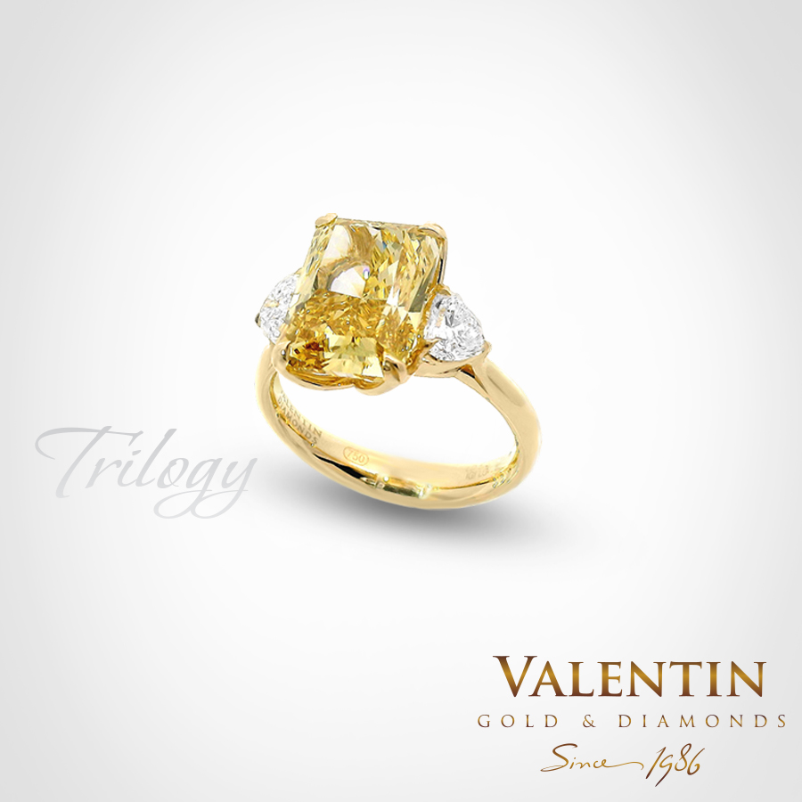 Масивен дамски (и годежен) пръстен от жълто злато 18к (проба 750). Централният камък е lab grown diamond с форма radiant – 5.02 карата. Отстрани са инкрустирани два laboratory diamonds сърца с общ карат 0.71 ct. Всички диаманти са сертифицирани от IGI. Сертификатите на скъпоценните камъни се издават от специализирани лаборатории и гарантират за качеството и произхода им. Това е достатъчна причина тези камъни да пазят цената си във времето и покупката на първокласно бижу да се превърне в инвестиция.  Подборът и селекцията на няколко инвестиционни камъка в едно бижу изисква време, познания, опит и прецизност, каквито нашите ювелири са постигнали с години практика. Посетете нашите бутици, пробвайте различни модели и цветове, ние ще съдействаме за вземане на точната мярка и ще помогнем за вашият избор.