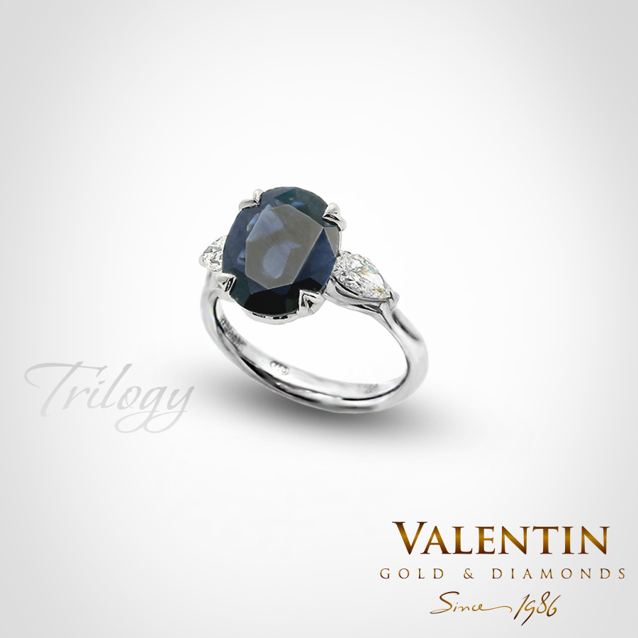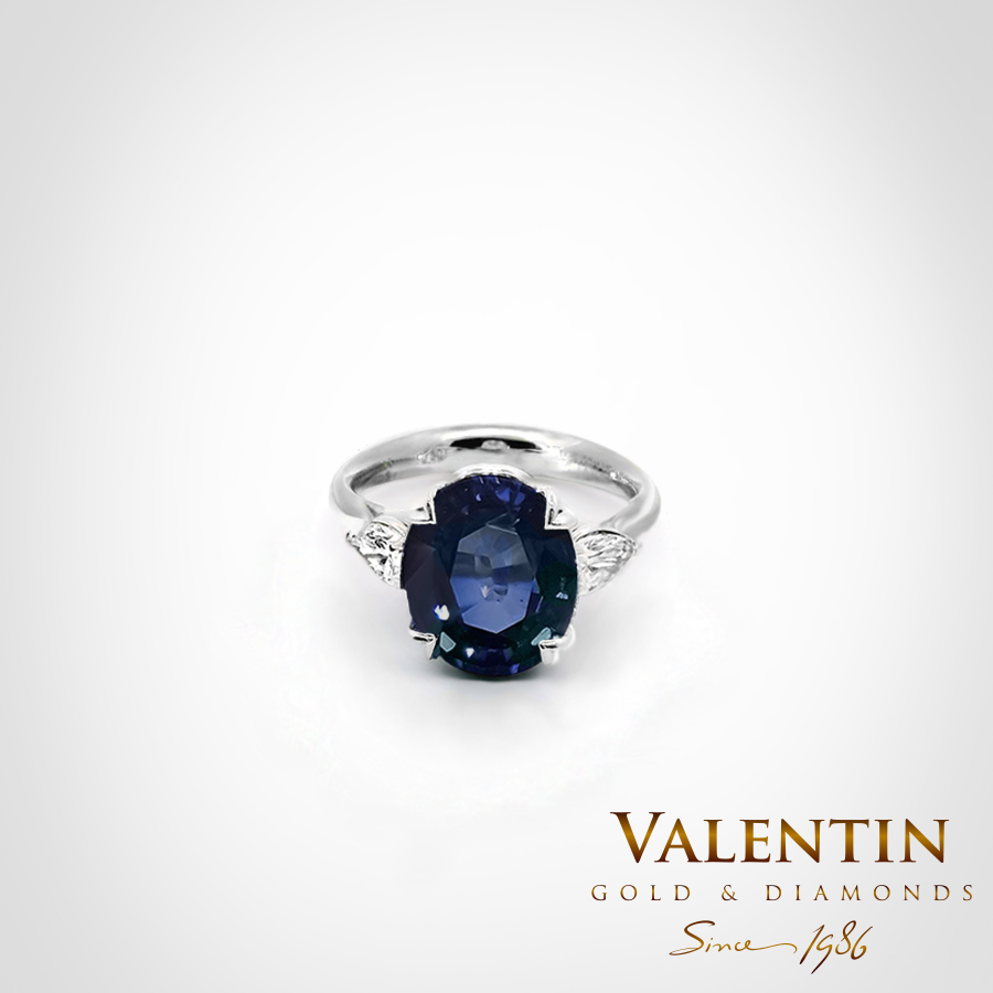 Масивен дамски пръстен от 18к злато (проба 750). Наличен e от бяло злато, но има възможност да се изработи жълт или розов. Централният камък е син сапфир овал 5.50 карата. Отстрани са инкрустирани два диаманта с форма капка, с общ карат 0.60 ct. Сапфирите са сертифицирани от GFCO, диамантите от GIA. Сертификатите на скъпоценните камъни се издават от специализирани лаборатории и гарантират за качеството и произхода им. Това е достатъчна причина тези камъни да пазят цената си във времето и покупката на първокласно бижу да се превърне в инвестиция. Подборът и селекцията на няколко инвестиционни камъка в едно бижу изисква време, познания, опит и прецизност, каквито нашите ювелири са постигнали с години практика. Посетете нашите бутици, пробвайте различни модели и цветове, ние ще съдействаме за вземане на точната мярка и ще помогнем за вашият избор.